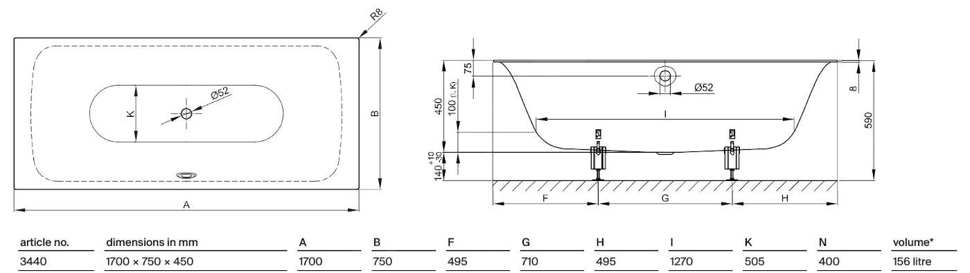 Badpoten en afvoer- en overloopgarnituur met een lengte van 725 mm niet meegeleverd, moeten apart worden besteld.