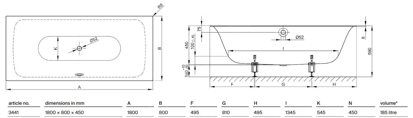 Badpoten en afvoer- en overloopgarnituur met een lengte van 725 mm niet meegeleverd, moeten apart worden besteld.