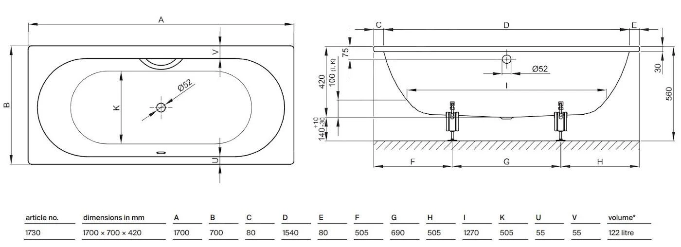 Badpoten en afvoer- en overloopgarnituur met een lengte van 725 mm niet meegeleverd, moeten apart worden besteld.
