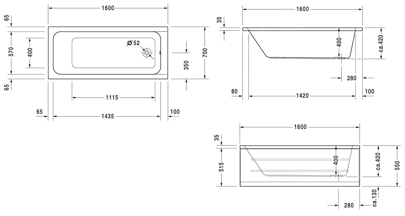 - diameter afvoer: 52 mm (aan het voeteneinde)