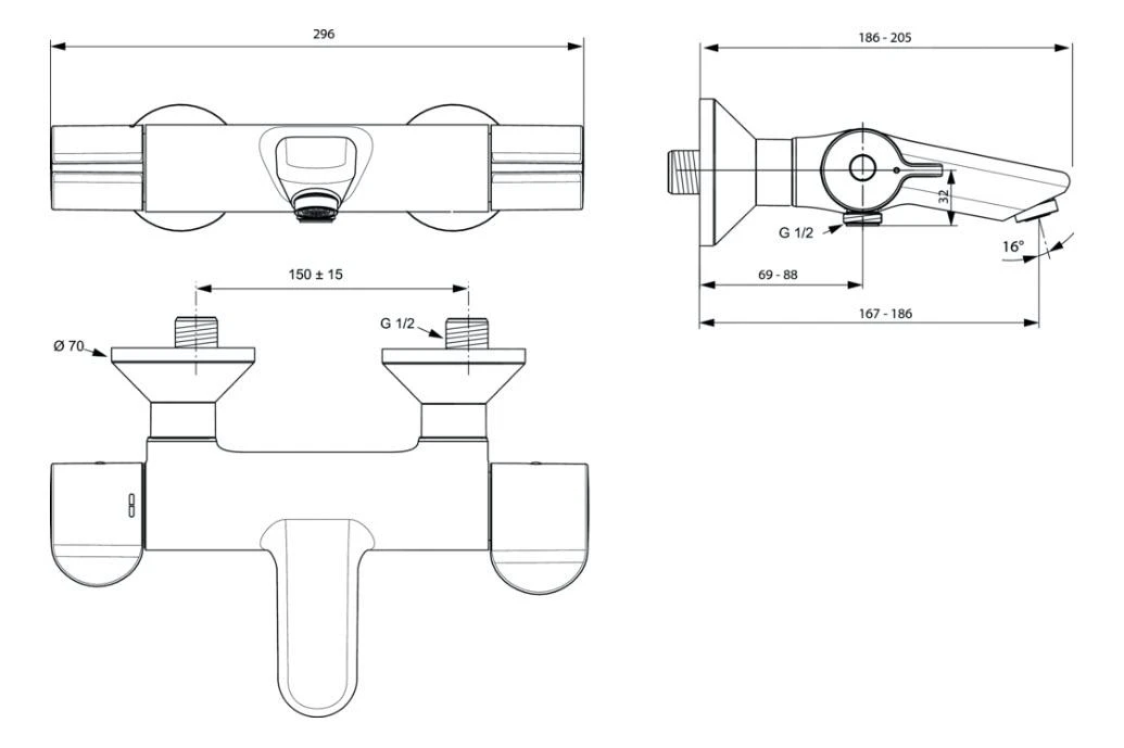 Thermostatische badkraan, wandmontage