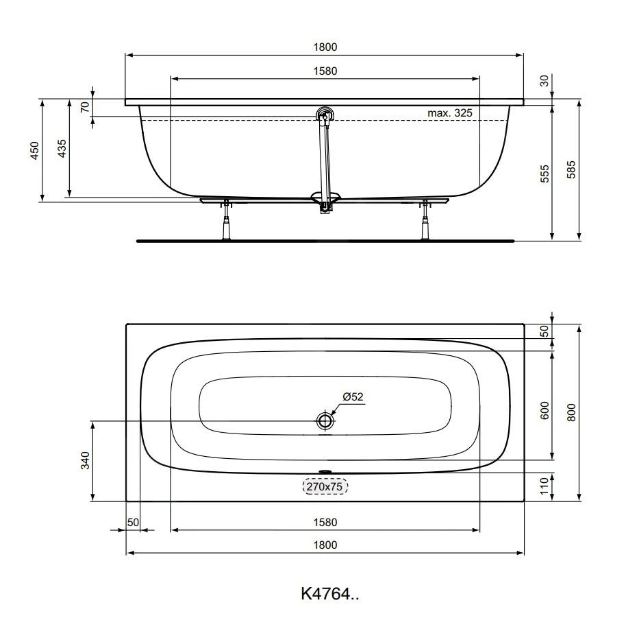 - afvoer in het midden: diameter 52 mm