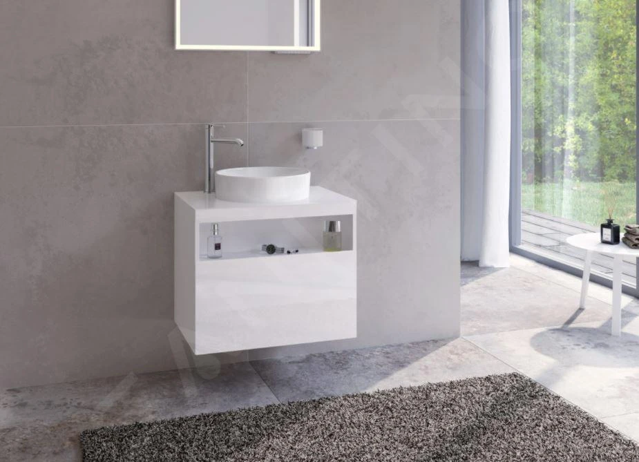 Kast onder ronde wastafel, gat voor wastafel en kraan aan de linkerkant, inclusief sifon