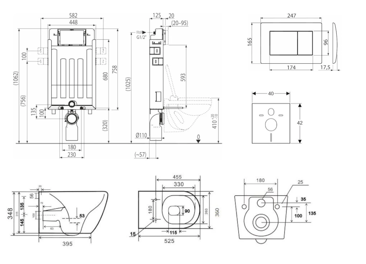 - Bevestigingsset voor het bevestigen van de toiletpot: draadstang M12 – 2 st., sluitringen – 4 st., afdekdoppen – 2 st., moeren – 2 st., draadbeschermers – 2 st.