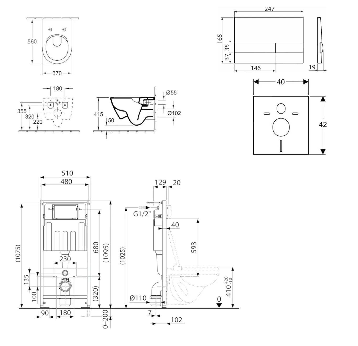 - bevestigingsset voor bevestiging van de toiletpot: 2x draadstang M12, 4x sluitringen, 2x doppen, 2x moeren, 2x draadbeschermer