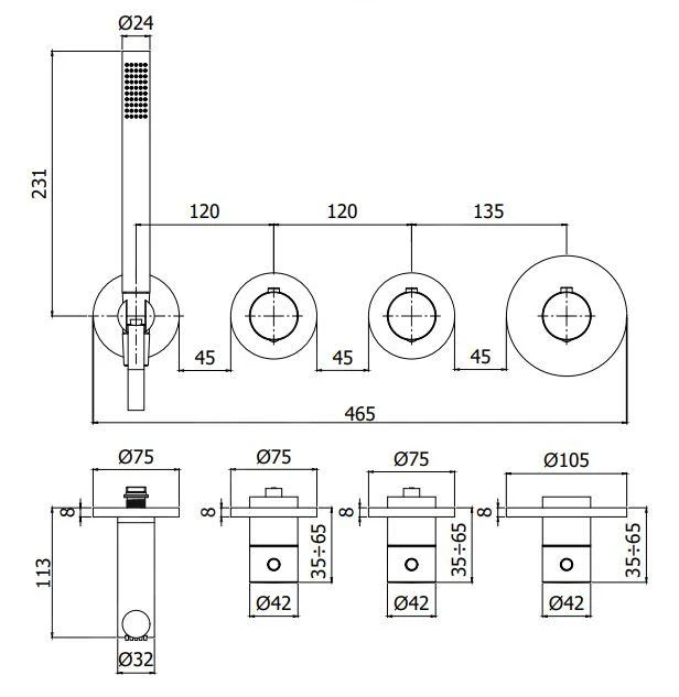 Thermostatische inbouwkraan, 4-gats installatie, zonder inbouwdeel
